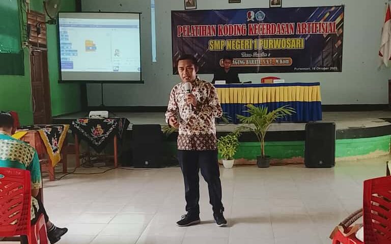 Pelatihan yang berlangsung di Aula SMPN 1 Purwosari ini dilaksanakan pada Kamis, 16 Oktober 2025, dengan fokus pada peningkatan kemampuan guru dalam memahami konsep berpikir komputasional, kerangka kerja kecerdasan artifisial, serta praktik koding menggunakan platform Scratch yang sesuai untuk pembelajaran tingkat sekolah menengah.